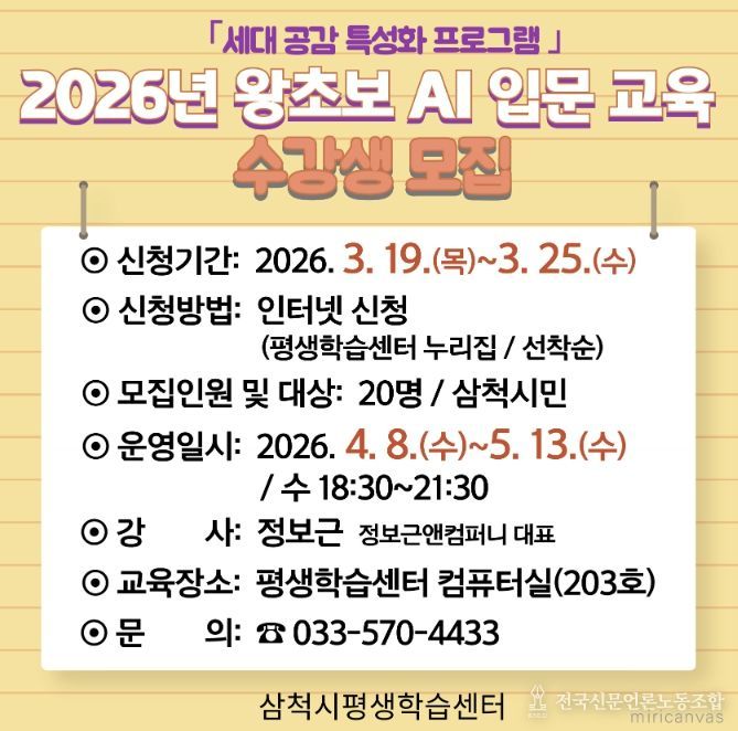 전국신문언론노동조합 강찬희 기자 | 삼척시는 3월 19일부터 3월 25일까지 삼척시민을 대상으로 ‘2026년 왕초보 AI 입문 교육’ 수강생을 모집한다고 밝혔다.
