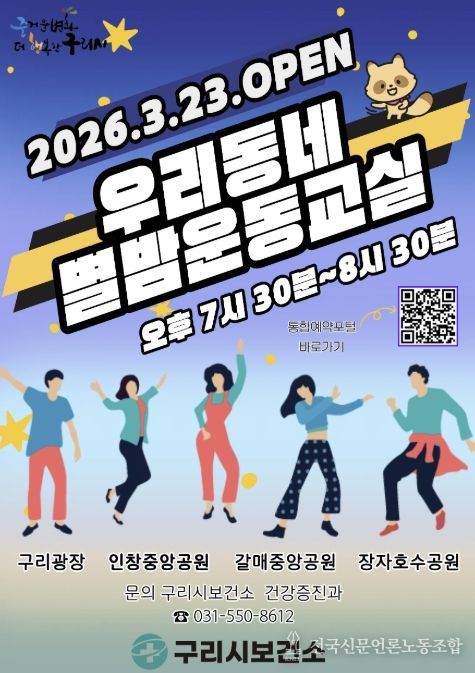 전국신문언론노동조합 김성길 기자 | 구리시는 3월 23일부터 10월 30일까지 지역 주민의 건강증진과 규칙적인 신체활동 실천을 돕기 위해 구리광장, 인창중앙공원, 갈매중앙공원, 장자호수공원 등 4개소에서 ‘우리동네 별밤운동교실’을 운영한다고 밝혔다.