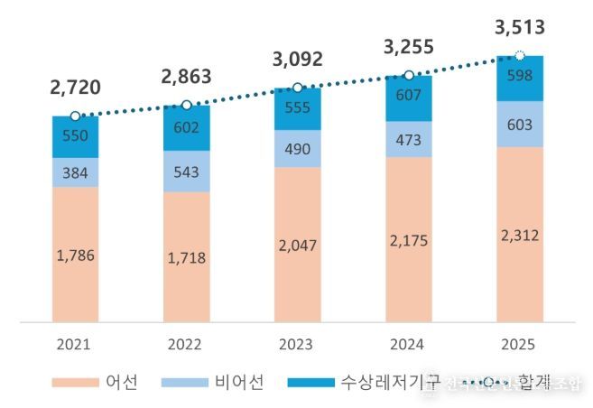 2025년에 해양사고는 총 3,513건이 발생하여 전년(2024년 3,255건) 대비 258건(7.9%) 증가했으며, 이로 인한 인명피해(사망·실종)는 137명으로 전년(2024년 164명) 대비 27명(16.5%) 감소한 것으로 나타났다.
