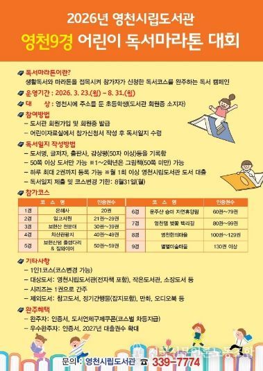 전국신문언론노동조합 강찬희 기자 | 영천시 평생학습관(관장 정경자)은 3월 23일부터 8월 31일까지 초등학생들의 독서 활성화를 위해 ‘영천9경 어린이 독서마라톤 대회’를 운영한다.