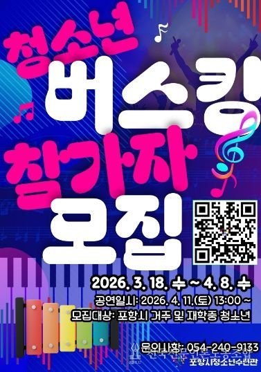 전국신문언론노동조합 강찬희 기자 | 포항시청소년재단 청소년수련관은 내달 8일까지 청소년들이 자신의 끼와 재능을 마음껏 펼칠 수 있는 무대인 ‘청소년 버스킹’ 참가자를 모집한다.