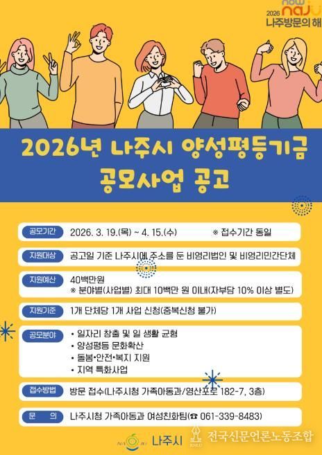 전국신문언론노동조합 강찬희 기자 | 전남 나주시가 일·생활 균형과 양성평등 문화 확산, 돌봄과 안전 복지 지원을 위한 ‘2026년 나주시 양성평등기금 공모사업’을 추진한다.