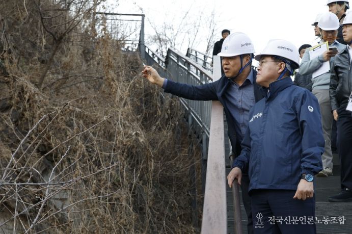 전국신문언론노동조합 강찬희 기자 | 진교훈 서울 강서구청장이 20일 해빙기 안전사고 예방을 위해 직접 급경사지 안전점검에 나섰다.