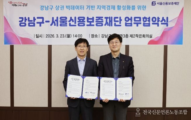 전국신문언론노동조합 강찬희 기자 | 꿈이 모이는 도시, 미래를 그리는 강남구가 3월 23일 구청에서 서울신용보증재단과 업무협약을 체결하고, 지역상권 활성화와 소상공인 지원을 위한 빅데이터 기반 협력체계 구축에 나섰다. 상권 현황을 보다 정밀하게 분석해 지역 특성에 맞는 정책을 발굴하고, 소상공인이 체감할 수 있는 지원책으로 연결하겠다는 취지다.