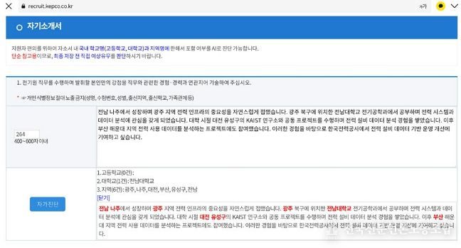 전국신문언론노동조합 강찬희 기자 | 한국전력이 채용 지원자의 편의를 높이고 공정한 채용 환경을 조성하기 위해, 자기소개서 AI 자가 진단과 네이버 인증 기반 자격증 자동 반영 서비스를 채용 시스템에 전격 도입한다.