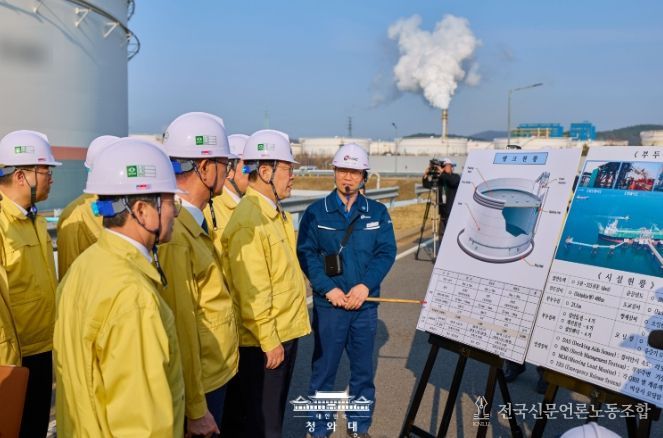 전국신문언론노동조합 강찬희 기자 | 이재명 대통령은 오늘 오후 충남 서산시 대산읍에 위치한 한국석유공사 서산비축기지를 방문해 비축유 관리 상황을 점검하고 주요 석유화학기업들과 현장 간담회를 가졌다.