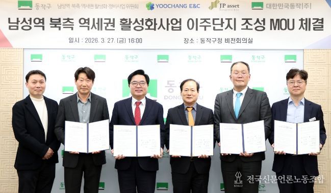 구는 지난 27일 구청 비전회의실에서 ▲동작주식회사 ▲JP에셋자산운용㈜ ▲㈜유창E&C ▲남성역 북측 역세권 활성화 사업 정비사업위원회와 ‘이주주택 조성 업무협약’을 체결하고 이같이 밝혔다.
