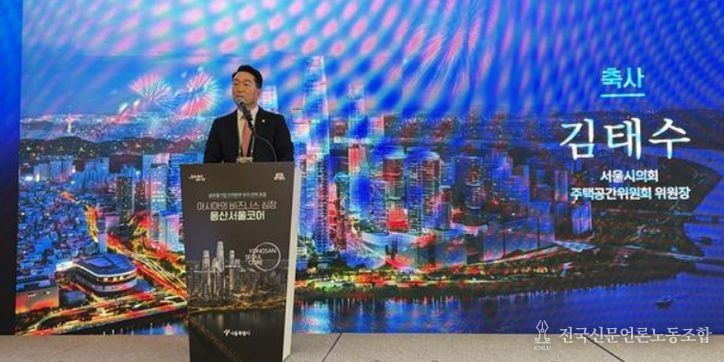 전국신문언론노동조합 강찬희 기자 | 서울특별시의회 주택공간위원회 김태수 위원장(국민의힘, 성북구 제4선거구)은 3월 27일 오후 2시, 전쟁기념관 피스앤파크(아주르홀, 4층)에서 개최된 '아시아의 비즈니스 심장, 용산서울코어 : 글로벌 기업 지역본부 유치 전략 포럼'에 참석하여 축사를 통해 용산 국제업무지구의 전략적 가치를 강조하고 서울특별시의회의 적극 지원 의지를 밝혔다.
