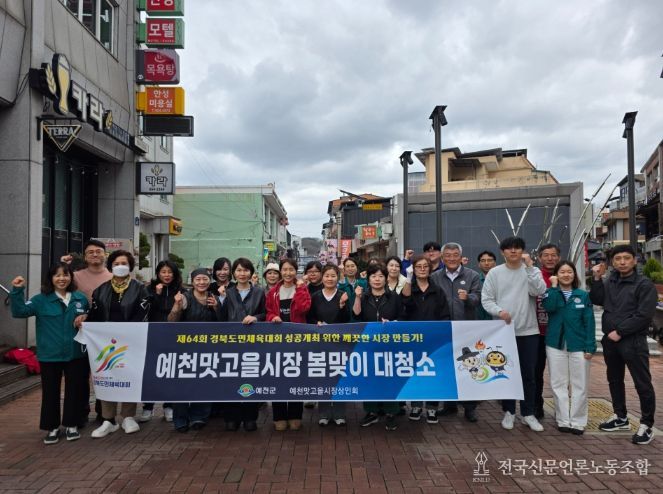 전국신문언론노동조합 강찬희 기자 | 예천군 예천맛고을시장 상인회(회장 양종례)는 제64회 경북도민체육대회를 앞두고 지난 31일 오후 3시, 상인 30여 명이 참여한 가운데 ‘봄맞이 대청소’를 실시했다.