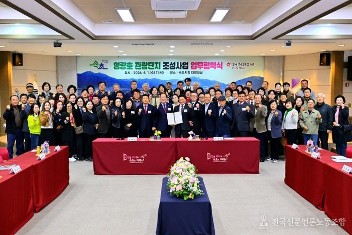 전국신문언론노동조합 강찬희 기자 | 속초시는 2026년 4월 1일 시청 대회의실에서 영랑호 관광단지 조성사업의 성공적인 추진을 위해 민간사업자인 ㈜신세계센트럴과 업무협약을 체결했다.