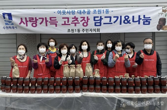 전국신문언론노동조합 김성길 기자 | 수원시 장안구 조원1동 주민자치회는 지난 1일, 복지행정분과 주관으로 ‘사랑가득 고추장 담그기’ 행사를 열고, 직접 담근 고추장을 관내 취약가구 200여 세대에 전달했다.