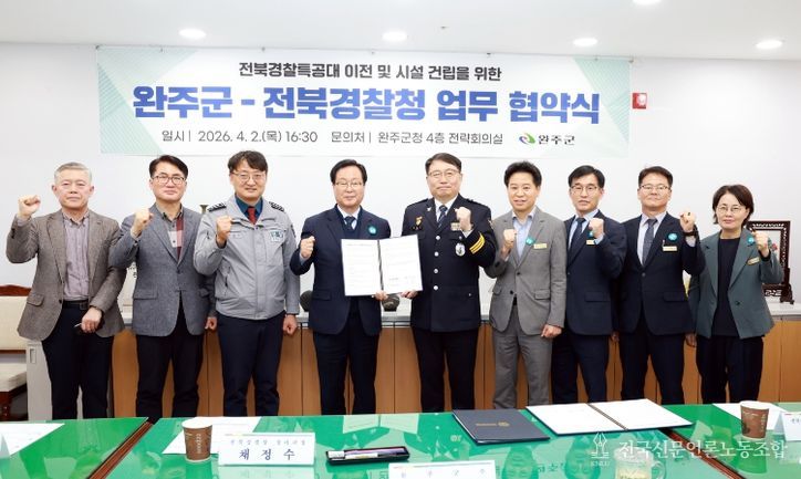 전국신문언론노동조합 강찬희 기자 | 완주군과 전북경찰청은 2일 완주군청 전략회의실에서 경찰특공대 이전 및 청사 신축을 위한 업무협약(MOU)을 체결하고 전북 경찰특공대 이전 사업을 본격적으로 추진하기로 했다.