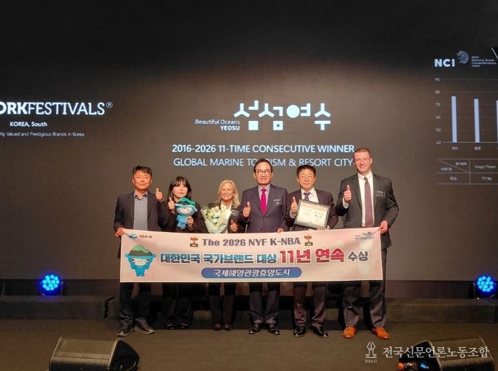 전국신문언론노동조합 강찬희 기자 | 여수시는 2일 오전 서울 롯데호텔에서 열린 ‘2026 대한민국 국가브랜드 대상’에서 11년 연속 국제해양관광휴양도시 부문 대상을 수상했다고 밝혔다.