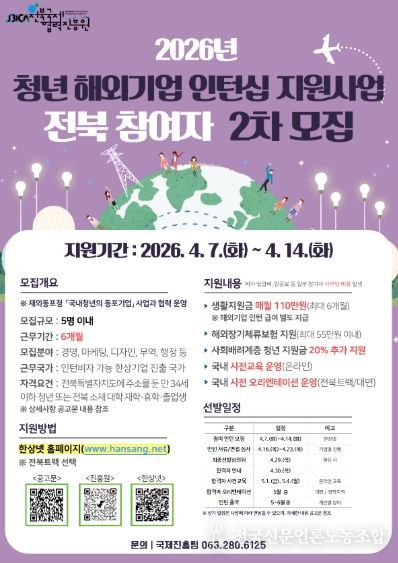 전국신문언론노동조합 강찬희 기자 | (재)전북국제협력진흥원은 도내 청년의 해외 진출과 글로벌 역량 강화를 위해 '청년 해외기업 인턴십 지원사업' 참여자를 오는 4월 7일부터 4월 14일까지 모집한다고 밝혔다.