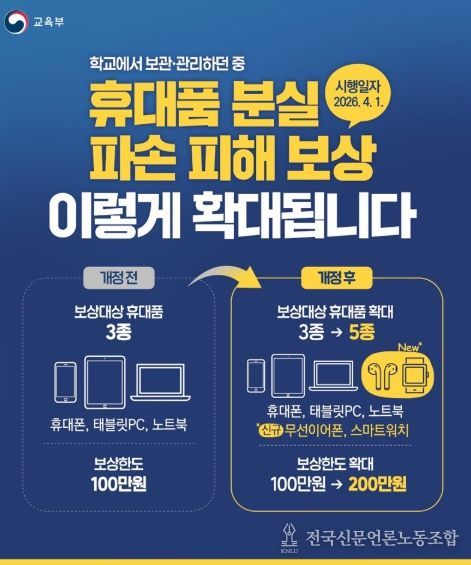 전국신문언론노동조합 강찬희 기자 | 학교에서 보관·관리하던 중 휴대품 분실·파손 피해 보상 이렇게 확대됩니다.
