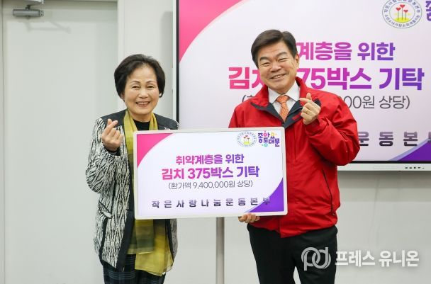 프레스유니온 강찬희 기자 | 서울 동대문구는 9일 작은사랑나눔운동본부(대표 이남숙)로부터 저소득 가정을 위한 김치 2㎏ 375박스(940만 원 상당)를 전달받았다고 밝혔다.