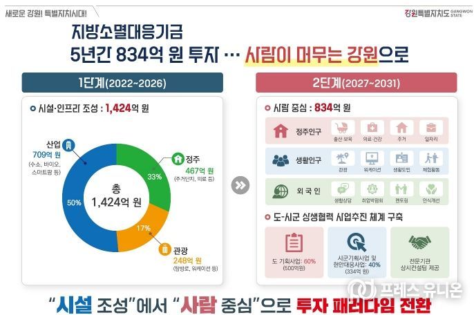 프레스유니온 강찬희 기자 | 강원특별자치도가 지방소멸대응기금을 기존 ‘시설‧인프라 중심’에서 ‘사람 중심’ 투자로 전환해 2027년부터 2031년까지 총 834억 원을 투입한다고 밝혔다.