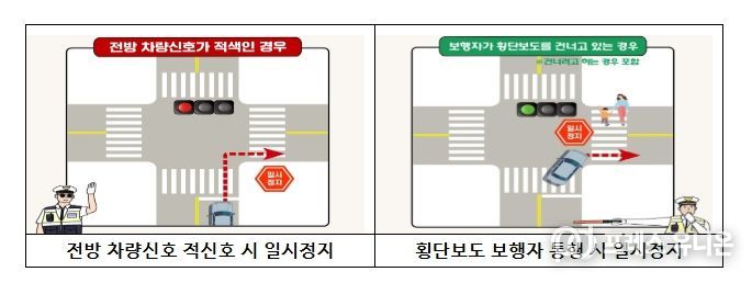 그러나 현장에서는 전방 차량 적신호 시 일시정지하지 않고 그대로 통과하거나, 일시정지 의무를 지키는 앞 차량을 향해 경적을 울리는 등 운전자 간 마찰과 법규 오인 사례가 발생하고 있어, 국민적 이해도를 높이기 위해 우회전 사고 위험이 높은 구간을 중심으로 집중단속을 실시한다. 차체가 커 우회전 시 보행자를 발견하기 어려운 버스・화물차 등의 사고 예방을 위한 운수업체 대상 교육·홍보도 적극적으로 실시할 방침이다.