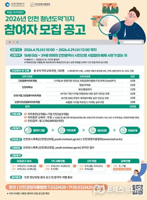 프레스유니온 강찬희 기자 | 인천광역시는 청년의 취업역량을 강화하고 지역기업이 필요로 하는 실무형 인재를 양성하기 위해 ‘2026 인천 청년도약기지’ 사업 참여자 130명을 4월 15일부터 4월 29일까지 모집한다고 밝혔다.