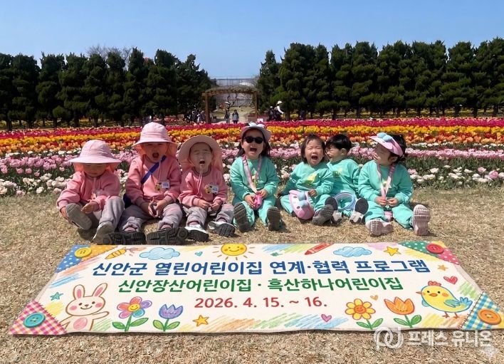 프레스유니온 강찬희 기자 | 신안군 국공립 어린이집인 흑산하나어린이집과 신안장산어린이집이 4월 15일부터 16일까지 1박 2일 일정으로 임자면 ‘2026 섬 튤립축제’를 방문하고, 열린어린이집 간 연계·협력 공동 캠핑 프로그램을 운영했다.