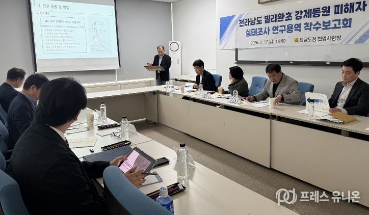 프레스유니온 강찬희 기자 | 전라남도는 일제 강제 동원 피해 진상규명과 국가 차원의 보상지원 건의를 위해 17일 도청에서 밀리환초 강제 동원 피해자 실태조사 연구용역 착수보고회를 개최했다.