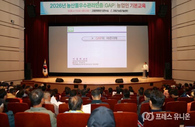 프레스유니온 강찬희 기자 | 고흥군은 지난 15일 고흥문화회관 김연수실에서 지역 농업인 344명이 참석한 가운데 2026년 농산물우수관리(GAP) 인증 농업인 기본교육을 실시했다고 밝혔다.