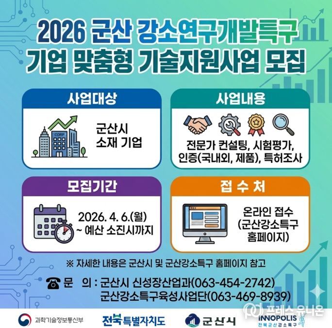 프레스유니온 강찬희 기자 | 군산시는 관내 기업의 기술 경쟁력 강화를 위해 ‘2026년 군산 강소연구개발특구 기업 성장단계별 기술지원사업’을 본격 추진한다고 밝혔다.