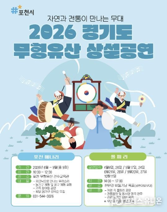 시 관계자는 “이번 상설공연은 포천의 소중한 무형유산이 시민들의 일상 속으로 깊숙이 다가가는 소중한 기회가 될 것”이라며, “앞으로도 우리 시의 유구한 역사와 문화자원을 관광 콘텐츠와 적극 연계하여, 누구나 찾고 싶고 머물고 싶은 ‘품격 있는 인문도시 포천’을 만들어 나가겠다”고 밝혔다.