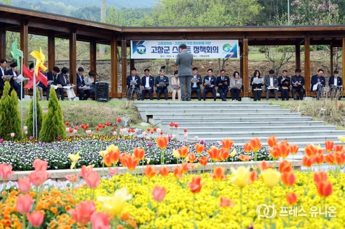 프레스유니온 강찬희 기자 | 전북 고창군이 20일 봄꽃이 만개한 꽃정원에서 스마트정책회의(간부회의)를 열고 “꽃정원을 주민여가 공간과 체류형 관광의 핵심으로 만들겠다”고 강조했다.