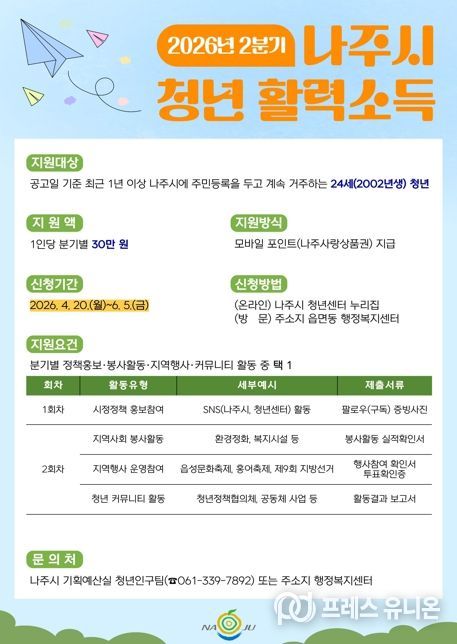 프레스유니온 강찬희 기자 | 전남 나주시가 지역 청년의 사회참여 확대와 안정적 정착을 지원하기 위해 공공활동 참여를 조건으로 분기별 30만 원을 지급하는 ‘청년 활력소득 지원사업’ 2분기 참여자 모집에 나선다.