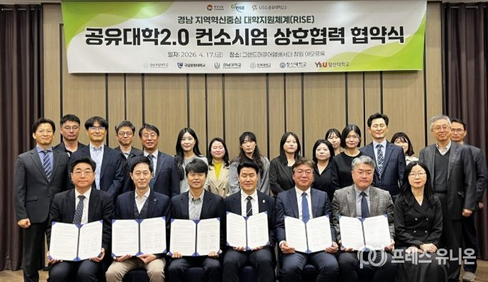 프레스유니온 강찬희 기자 | 경상국립대학교 라이즈(RISE) 사업단 지역교육혁신센터는 4월 17일 창원 그랜드머큐어호텔에서 ‘공유대학2.0 컨소시엄 과제’ 참여대학 간 상호 협력 협약(MOU)을 체결했다.