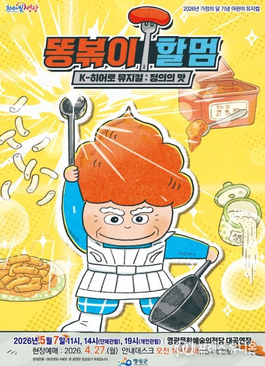 프레스유니온 강찬희 기자 | 영광군은 오는 5월 7일 오전 11시(단체관람), 오후 2시(단체관람), 7시에 영광문화예술의전당 대공연장에서 가정의 달 특집공연 웃음과 감동, 그리고 건강한 메시지를 전하는 이야기 ‘어린이뮤지컬 똥볶이 할멈’을 공연한다.