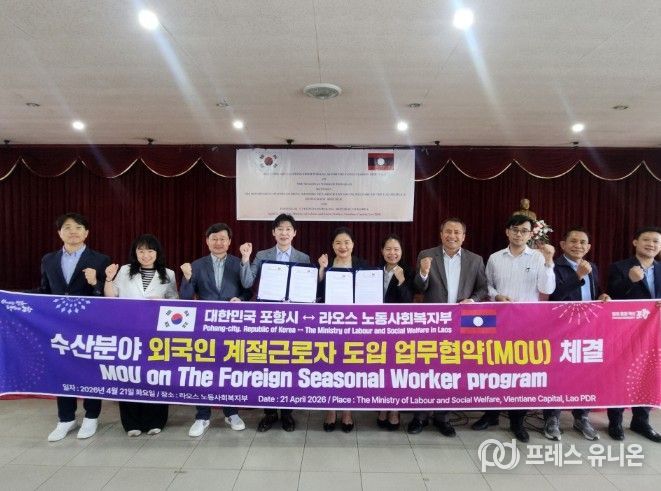 프레스유니온 강찬희 기자 | 포항시는 지역 내 과메기·오징어 건조 등 수산물가공업 분야의 인력 부족 문제를 해결하기 위해 21일(현지시간) 라오스 비엔티안에서 라오스 노동사회복지부와 ‘외국인 계절근로자 도입을 위한 업무협약(MOU)’을 체결했다.