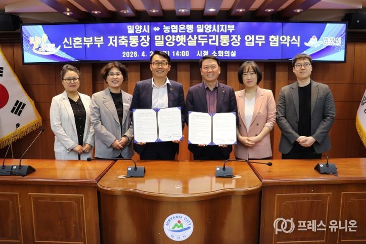 프레스유니온 강찬희 기자 | 경남 밀양시는 21일 시청 소회의실에서 농협은행 밀양시지부와 ‘밀양햇살두리통장 지원사업’의 원활한 추진을 위한 업무협약을 체결했다.