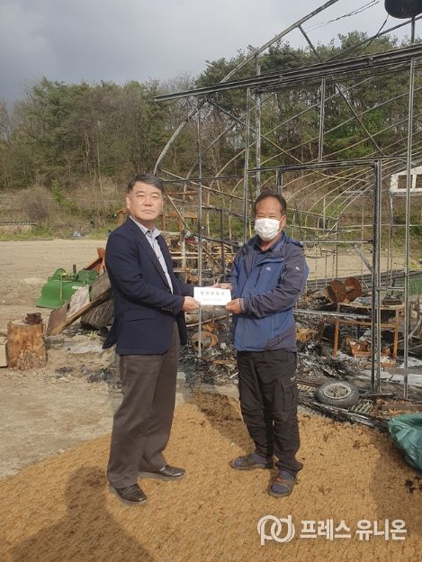 이번 지원 대상은 지난 4월 9일 농지에 발생한 화재로 인해 큰 피해를 입은 남면 유치1리 주민이다. 당시 화재로 창고용 비닐하우스와 트랙터 등이 모두 전소되는 피해가 발생했다. 다행히 인명 피해는 없었지만, 본격적인 영농철을 앞두고 막대한 재산 피해를 입어 생계 유지와 농업 활동에 어려움을 겪고 있는 실정이다.