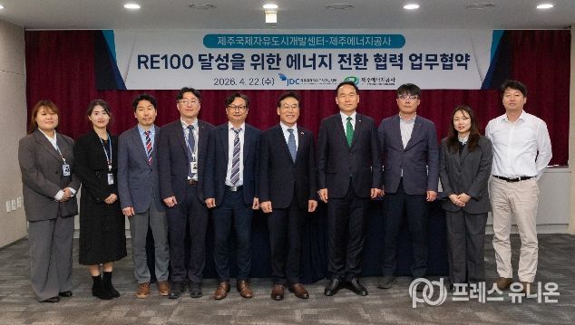 프레스유니온 강찬희 기자 | 제주국제자유도시개발센터는 제주에너지공사와 ‘RE100 달성을 위한 에너지 전환 협력 업무협약’을 체결하고, 재생에너지 도입 확대와 에너지 전환 관련 사업 발굴을 위한 협력체계를 구축한다고 밝혔다.