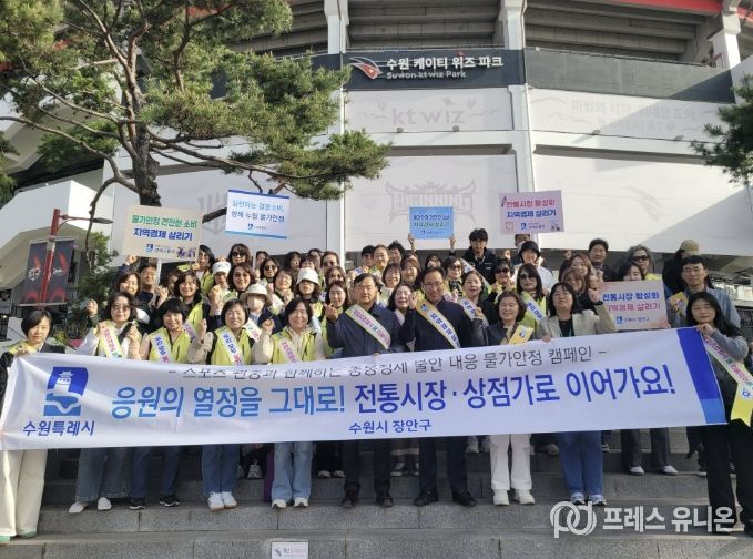 프레스유니온 김성길 기자 | 수원시 장안구는 지난 22일, 수원KT위즈파크 일대에서 야구관중을 대상으로 지역경제 활성화를 위한 캠페인을 추진했다. 이번 캠페인에는 장안구청장을 비롯해 관계 공무원과 물가모니터요원 등 20여 명이 참여했다.