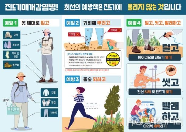 임승관 질병관리청장은 “SFTS 환자는 주로 4~11월에 농작업 및 야외활동 이후 발생하므로, 진드기에 물리지 않도록 긴 옷, 모자, 양말 등을 착용하여 노출 부위를 줄이고, 기피제를 사용할 것”을 강조하며, “야외활동 후 2주 이내 고열, 소화기 증상 등이 있을 경우 즉시 의료기관을 방문하여 진료받을 것”을 당부했다.