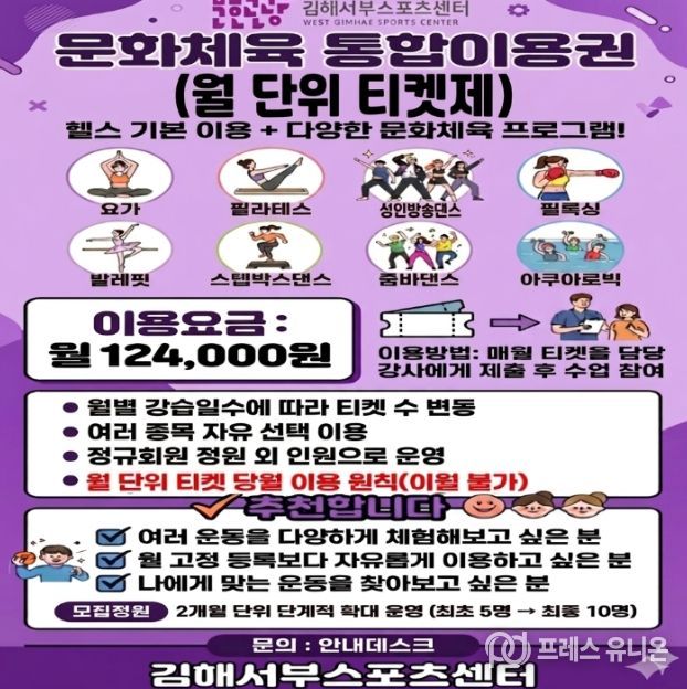 프레스유니온 강찬희 기자 | (재)김해문화관광재단 김해서부스포츠센터는 이용자 중심의 유연한 운동환경 조성과 문화체육 프로그램 활성화를 위해 김해시 공공체육시설 최초로 ‘문화체육 티켓제 통합이용권’ 도입을 추진한다고 밝혔다.