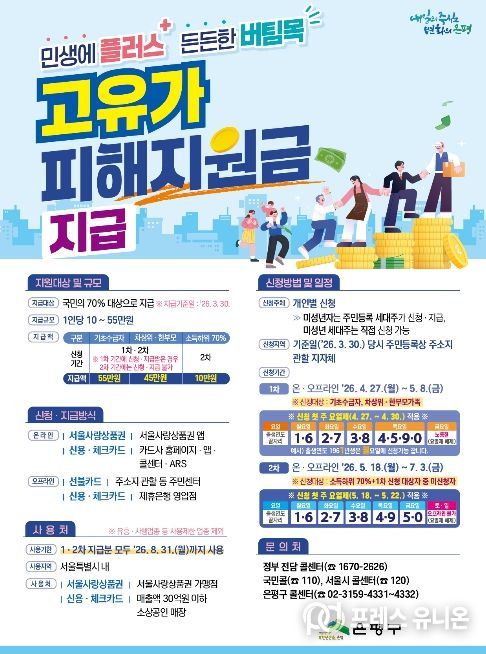 프레스유니온 강찬희 기자 | 서울 은평구는 고유가·고물가 등으로 커진 구민들의 생활비 부담을 덜고 지역 내 소비를 촉진하기 위해 오는 27일부터 ‘고유가 피해지원금’을 지급한다고 밝혔다.
