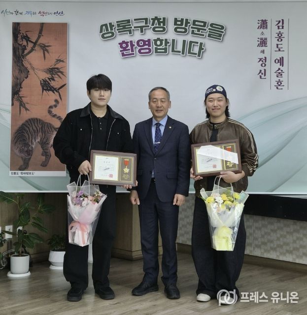 프레스유니온 김성길 기자 | 안산시 상록구는 지난 23일 구청장실에서 성안고 사거리 종이 유출 사고 현장에서 자발적으로 수거 활동에 나선 한양대학교 ERICA 캠퍼스 학생 2명에게 ‘모범시민 표창’을 수여했다고 24일 밝혔다.