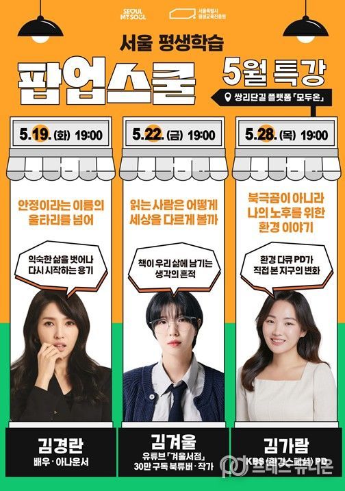 프레스유니온 강찬희 기자 | 서울특별시평생교육진흥원이 지난 4월 도봉구 쌍문역 인근에 개관한 서울시 첫 역세권 평생학습 거점 ‘서울 평생학습 팝업스쿨’을 확대 운영한다. 시범운영 한 달간 500여 명이 참여했으며, 5월에는 정규강좌, 명사특강, 러닝숍 등 3개 영역에서 총 13개 과정을 편성하고, 650명의 시민 참여를 목표로 한다.