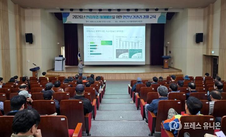 프레스유니온 강찬희 기자 | 영덕군은 산림 현장의 안전사고를 예방하고 근로자의 보건 안전을 강화하기 위해 지난 23일 영덕 로하스 수산식품지원센터에서 ‘산림사업 재해예방 안전보건 관리 강화교육’을 시행했다.