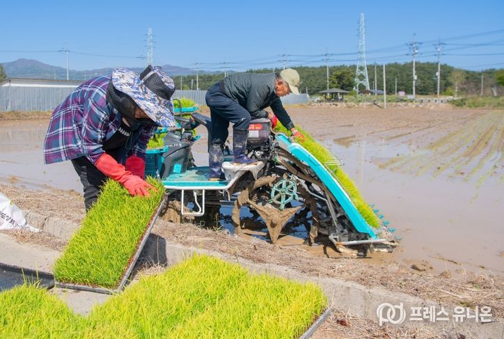 프레스유니온 강찬희 기자 | 평화 경제 거점 도시 강원 고성군은 4월 24일 간성읍 교동리에서 올해 첫 모내기를 실시했다.