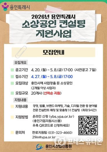 프레스유니온 김성길 기자 | 용인특례시와 용인시산업진흥원은 ‘2026년 용인시 소상공인 창업 및 경영 컨설팅 지원사업’에 참여할 소상공인을 모집한다고 26일 밝혔다.