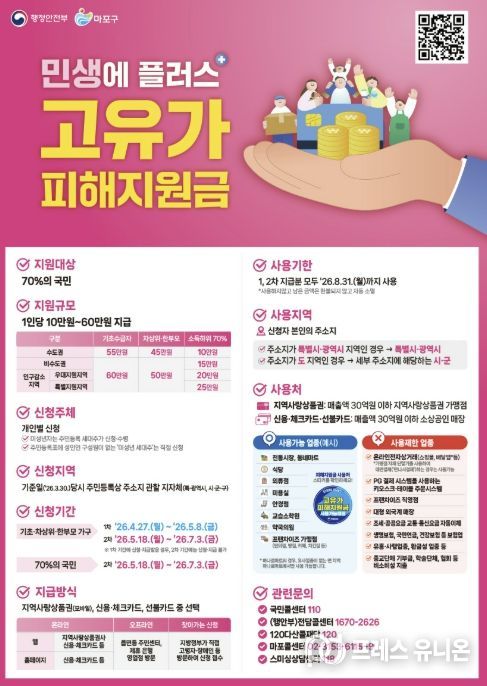프레스유니온 강찬희 기자 | 마포구는 중동 전쟁 여파로 이어진 고유가·고물가 상황 속에서 구민의 경제적 부담을 덜고 지역경제에 활력을 불어넣기 위해 ‘고유가 피해지원금’을 지급한다.