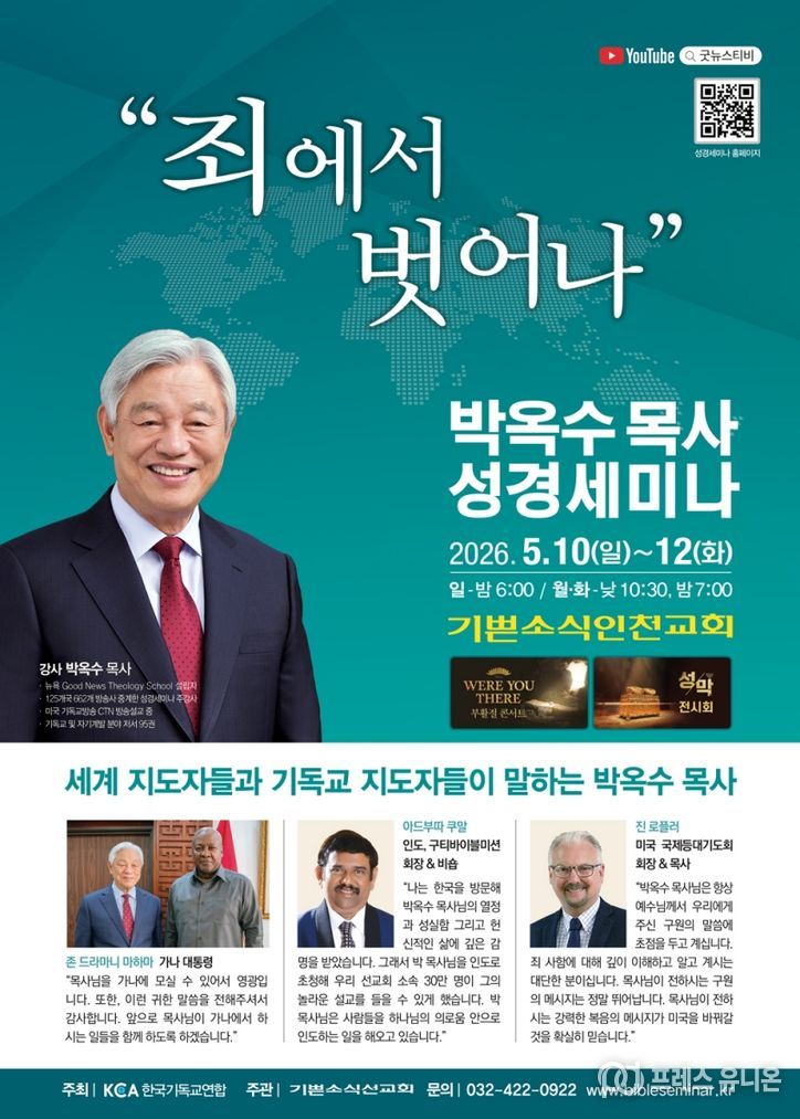 프레스유니온 강찬희 기자 | ‘2026 박옥수 목사 성경세미나’가 5월 10일(일)부터 12일(화)까지 3일간 기쁜소식인천교회에서 열린다.