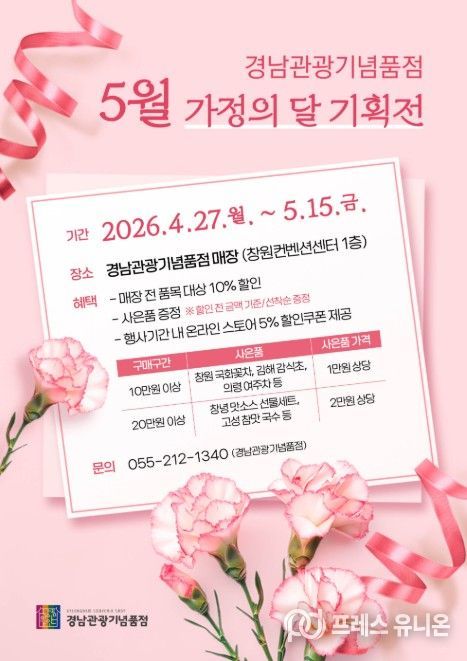 프레스유니온 강찬희 기자 | 경상남도는 ‘5월 가정의 달’을 맞아 경남관광재단이 운영하는 경남관광기념품점에서 4월 27일부터 5월 15일까지 약 3주간 풍성한 혜택을 담은 특별 기획전을 선보인다고 밝혔다.