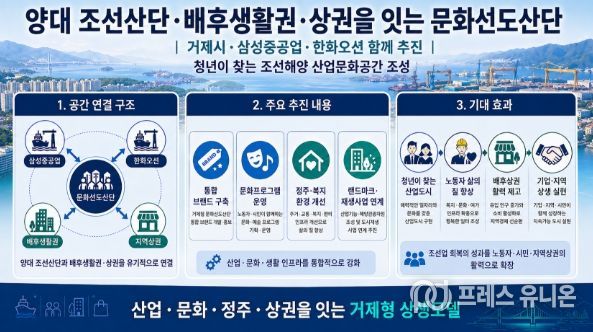 프레스유니온 강찬희 기자 | 거제시가 삼성중공업, 한화오션과 체결한 지역상생발전 협약을 바탕으로 양대 조선산업단지와 인근 배후생활권, 지역상권을 함께 잇는 문화선도산단 조성사업 공모 준비에 본격 나선다.