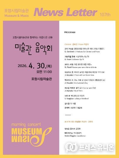 프레스유니온 강찬희 기자 | 포항시립미술관은 오는 30일 오전 11시 미술관 로비에서 제107회 미술관 음악회 ‘MUSEUM·MUSIC’을 개최한다.